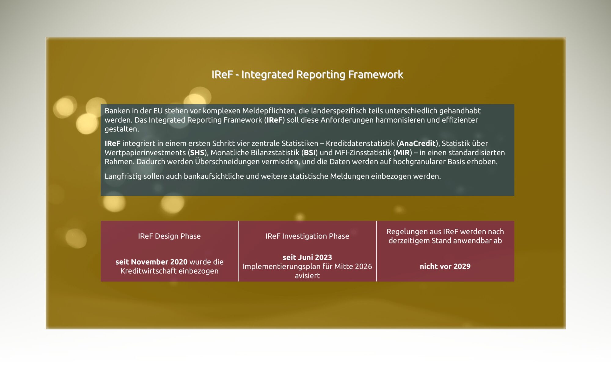 IReF hat zum Ziel, die „… bestehenden statistischen Datenanforderungen des ESZB so weit wie möglich in einen einheitlichen, standardisierten Berichtsrahmen zu integrieren. Dazu sollen in einem ersten Schritt im Wesentlichen die vier statistischen Erhebungen Kreditdatenstatistik (AnaCredit), Statistik über Wertpapierinvestments (Securities Holdings Statistics (SHS)), Monatliche Bilanzstatistik (BSI) und MFI-Zinsstatistik (MIR) in einer gemeinsamen Verordnung überschneidungsfrei vereint und soweit möglich auf hochgranularer Basis (Einzelkreditbasis, Einzelwertpapierbasis, Einzelkund*innenbasis) erhoben werden.